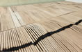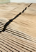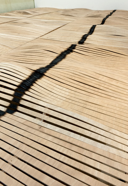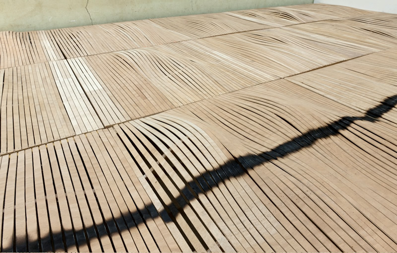 Sous nos yeux s'étant un paysage. Bois blond aux ondulations tranquilles comme blessé par la stridence d'une ligne discontinue, sombre et douloureuse. Ce plancher flottant assemblé avec patience par Ilana Isehayek offre le spectacle d'un doux roulis. Sagement assemblées, les lames de bois tracent des lignes continues qui soudain enflent et se boursouflent amenant la matière juste en-dessous de son point de rupture. Comme la cage thoracique d'un animal, le plancher s'abaisse et se soulève animé par le souffle d'une respiration. Mais ce grand corps-paysage est durement marqué par une profonde brûlure dont le regard suit la ligne, continue ou discontinue, selon les points de vue et dont le lent travail de sape semble se poursuivre par une combustion silencieuse.