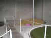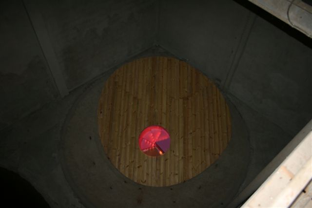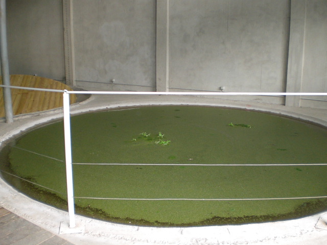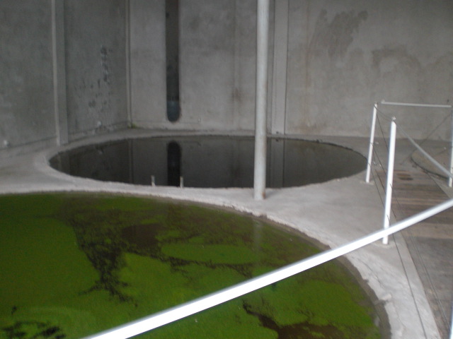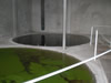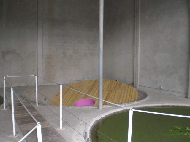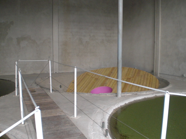 Dans les anciens silos, interaction entre quatre bassins. Trois remplis de l’eau de la rivière (travail évolutif sur l’évolution végétale – lentilles d’eau) et le dernier consacré à l’installation d’une plateforme en bois au milieu de laquelle se trouve un escalier évoquant une descente sans fin mais non praticable.