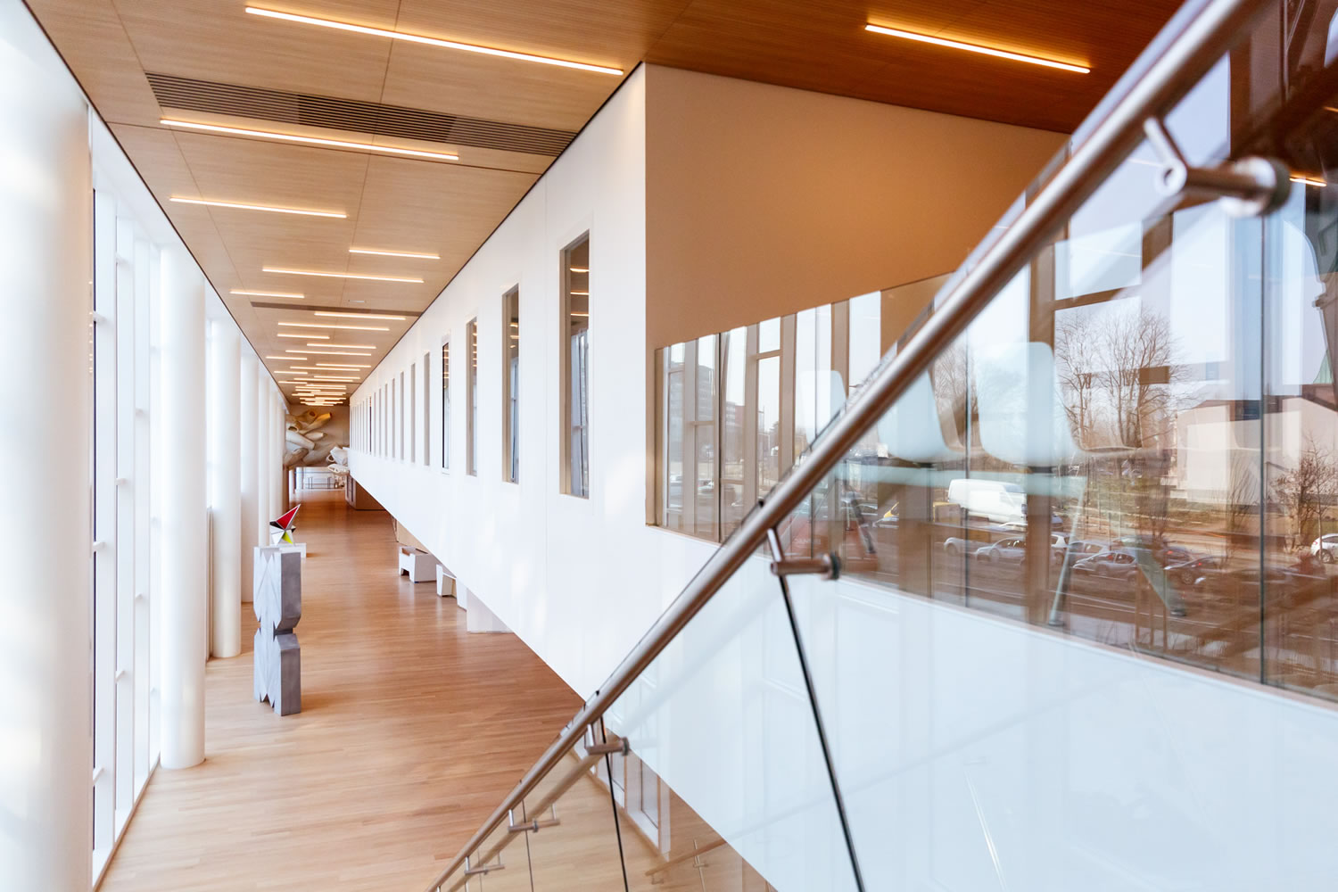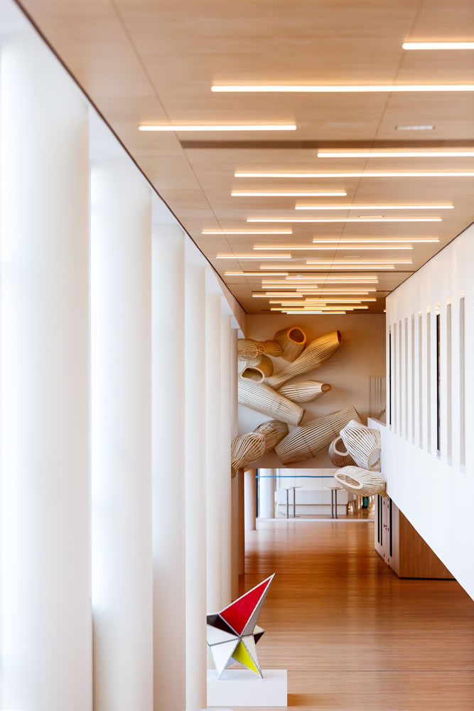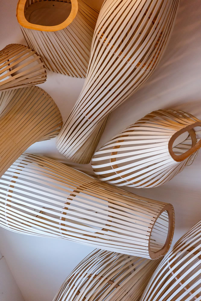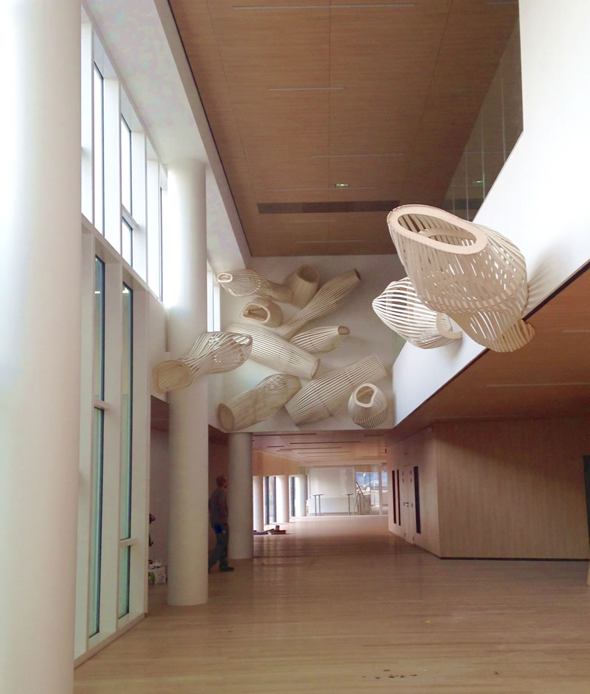 J'imagine, la sensation d'espace et de lumière qui saisira le patient à son entrée dans le hall de la nouvelle clinique Rhéna. On l'accueille, on le guide. Son regard court le long de la coursive supérieure. Il est attiré par trois formes fluides et légères qui s'acheminent comme aimantées à l'extrémité du hall. Ces formes sont faites du même bois et font appel aux mêmes techniques d'assemblage, des techniques que m'inspirent depuis toujours les charpentiers navals. Elles appartiennent à une même famille et pourtant elles ont chacune leurs particularités, leur histoire. Elles parlent de voyage, de rencontres et de nouvelles fondations. Suspendues dans ce bâtiment qui se pose sur les rives du Rhin - ces rives délaissées jusqu'alors par les activités civiles - ces formes de couples assemblés parlent du commerce des hommes. Telles des barques légères en route vers d'autres rivages, elles évoquent le chantier permanent des nouvelles associations. Le spectateur en perçoit le cheminement, la dynamique et les formes qui naissent de leur rapprochement. Il perçoit également un hors-champ que son imaginaire peut poursuivre au-delà du visible, du côté du sensible, dans les jeux d'ombre et de lumière. .