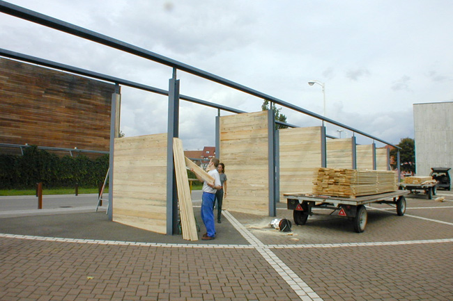 Première étape: Construction de trois volumes en planches de bois sur une structure métallique existante. "Living-room", "bed-room", "salon"… sont inscrit sur chacun des côtés. Des judas invitant les spectateurs à voir les photographies des scènes d’intérieur ; images qui m’étaient envoyées par e-mail du Canada.