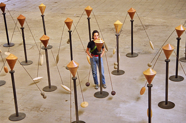 En bois poli, emmanchés de balanciers en tiges de fer terminées de contrepoids en boules, disques, pelotes, lentilles, fusaïoles de bois blanc ou teinté, reposant de l'extrémité d'une pointe effilée sur un petit disque d'acier soudé à un fort tube de métal, sont des sortes de toupies, patiemment construites par llana Isehayek selon les techniques du lamellé-collé. (...)