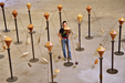 21 toupies en bois (chacune différente) sur colonnes en acier avec contrepoids en bois tourné.