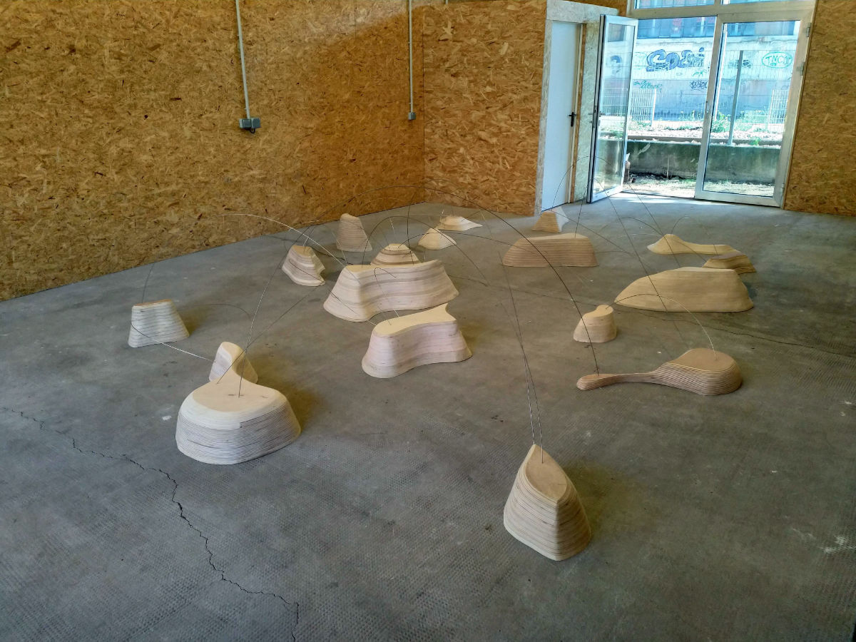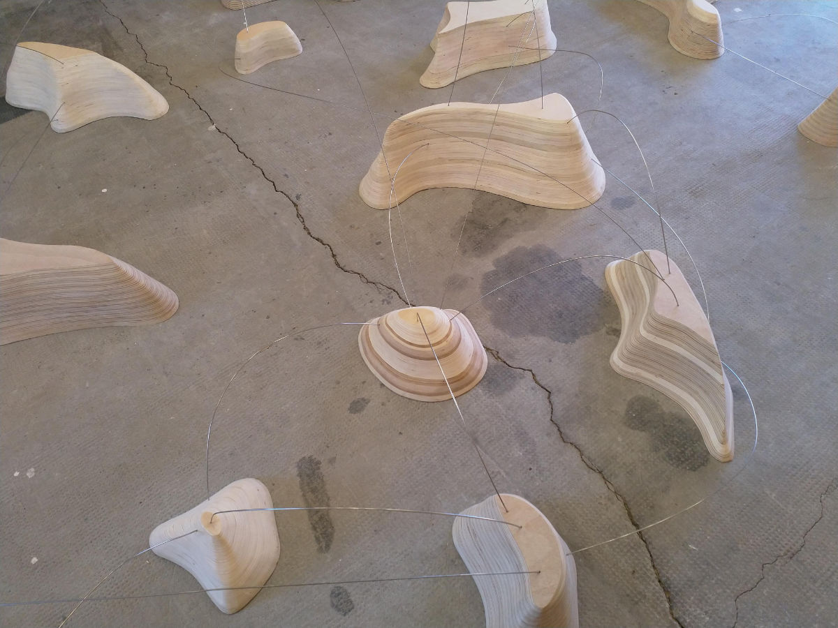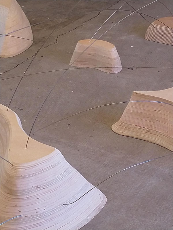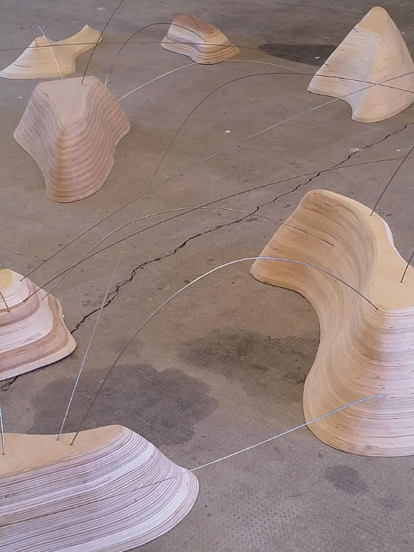 Les éléments présentés ici font partis d’un travail en cours de conception. D’autres pourront venir s’y ajouter et à terme, un filin d’acier pourrait connecter chacun d’eux. La composition d’ensemble pourravarier d’un contexte d’exposition à l’autre. Nous retrouvons dans ces volumes la prédilection d’Ilana Isehayek pour la technique du bois lamellé-collé qu’elle maîtrise ici à la perfection.